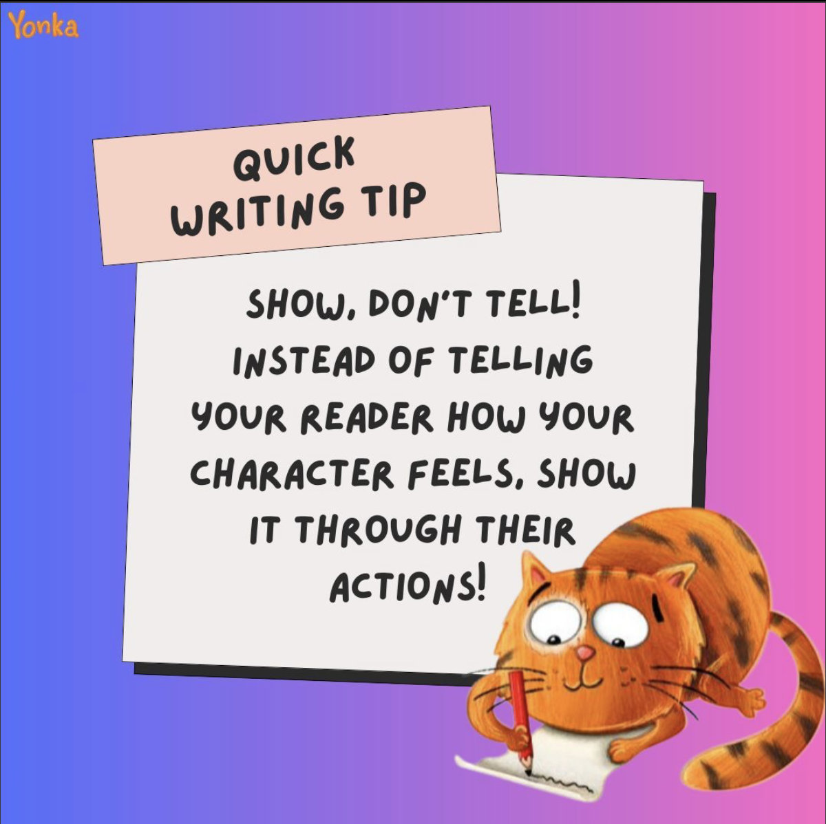 Instead of telling your reader how your character feels, show it through their actions! For example: 📝 Instead of saying “She was excited,” Try: “She jumped up and down, clapping her hands!” 🎉 By showing, you make your story more fun and exciting to read!